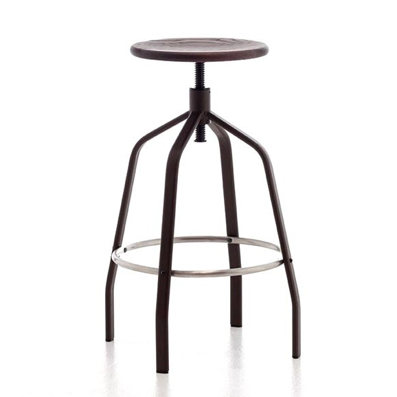 Uma banqueta estilo industrial com regulagem de altura. A banqueta Vit é produzida com tubo oblongo de e assento de madeira, possui regulagem na altura como pode ser visto nas fotos.