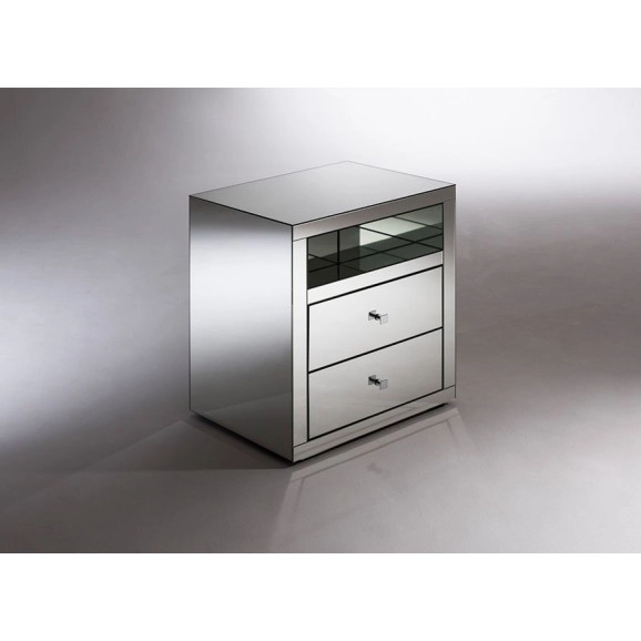 O Criado Mudo Espelhado é todo em MDF revestido em espelho, deixando ainda mais moderno e espaçoso seu ambiente. São 2 Gavetas e um nicho também espelhado.
