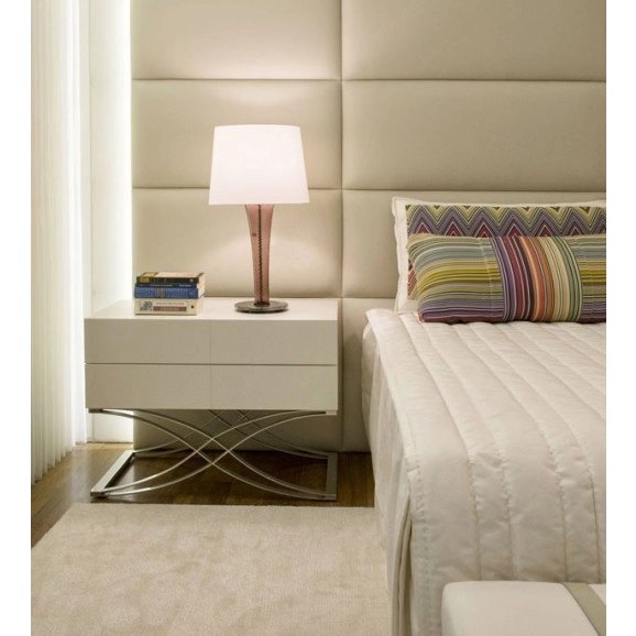 A mesa de cabeceira Lux possui duas gavetas com sistema Click para abrir, base de aço inox polido produzida com barras maciça. Confira abaixo as opções!