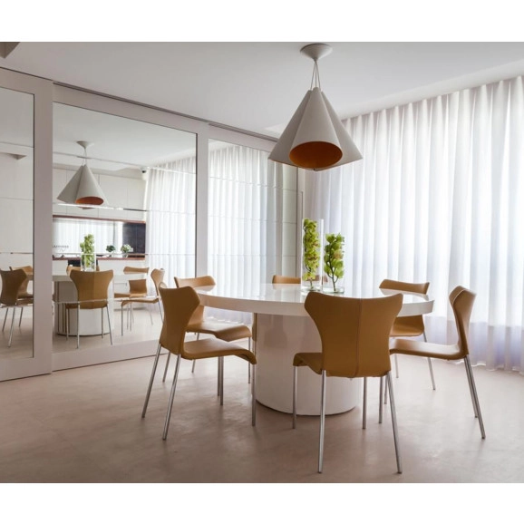 Confira a mesa de jantar redonda Sphera, você pode personalizar o tamanho, o acabamento e escolher se deseja tampo de vidro ou não. Ela é fabricada com todo cuidado, nenhuma emenda fica aparente pois é usada lâmina para cobrir emendas e para a pintura ficar ainda melhor.