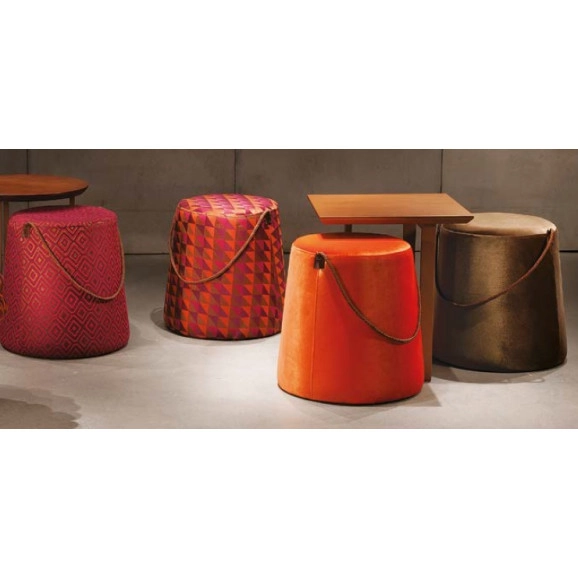 Puff em madeira totalmente estofado com alça trançada em couro natural.